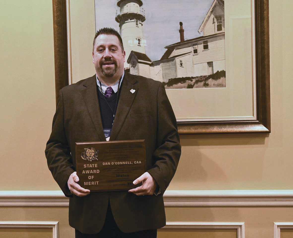 The award citation reads as follows: “In recognition of outstanding leadership , and meritorious achievement in interscholastic administration. The 2023 State Award of Merit is presented to Dan O’Connell, C.A.A. by the National Interscholastic Athletic Administrators Association in cooperation with the Maine Interscholastic Athletic Administrators Association.”