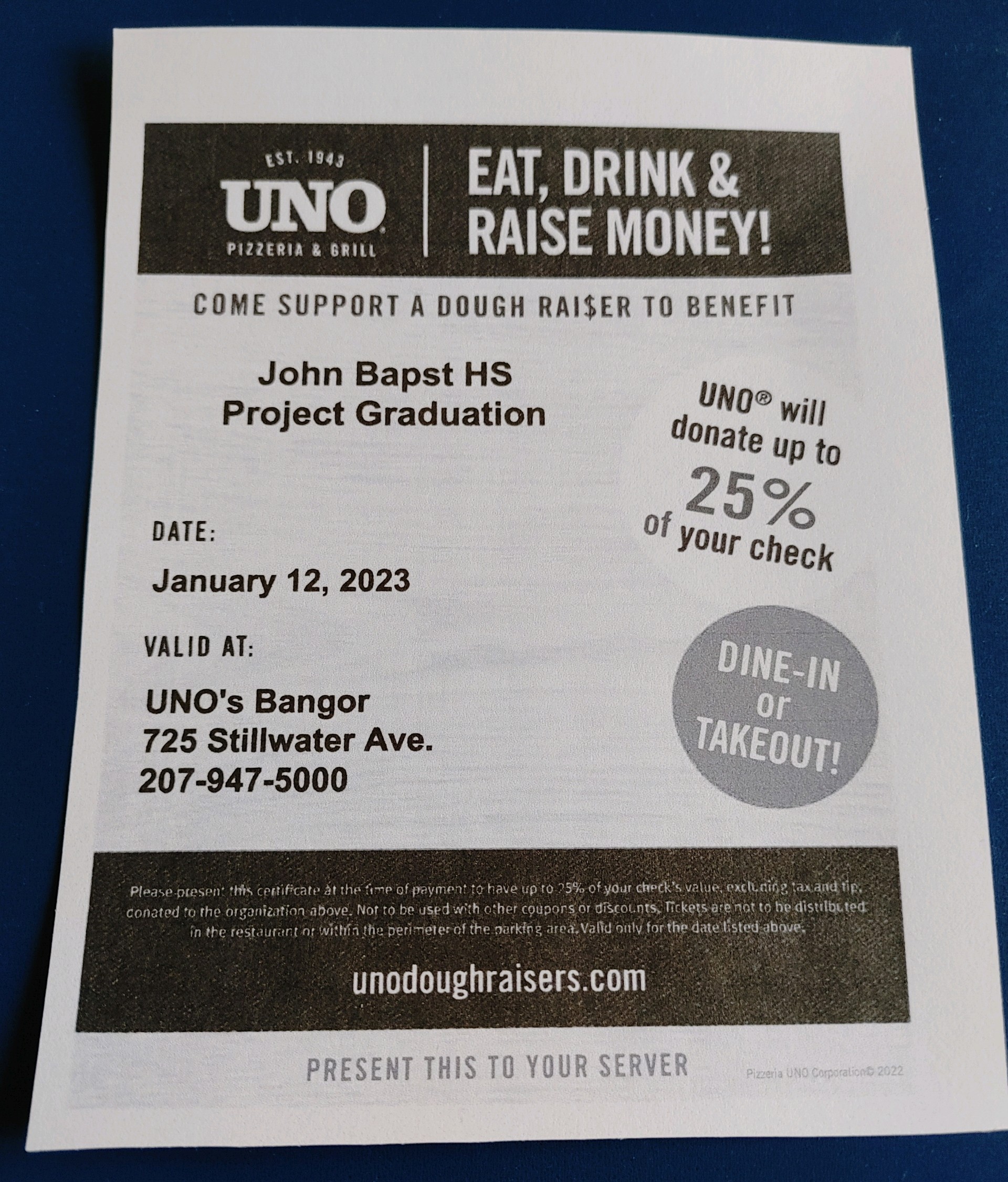 Enjoy some Uno’s on January 12, 2023 to benefit the Class of 2023 Project Graduation By Jennifer Tower in Community, Featured on January 5, 2023Must show the COUPON to qualify (linked here) Post Views: 0