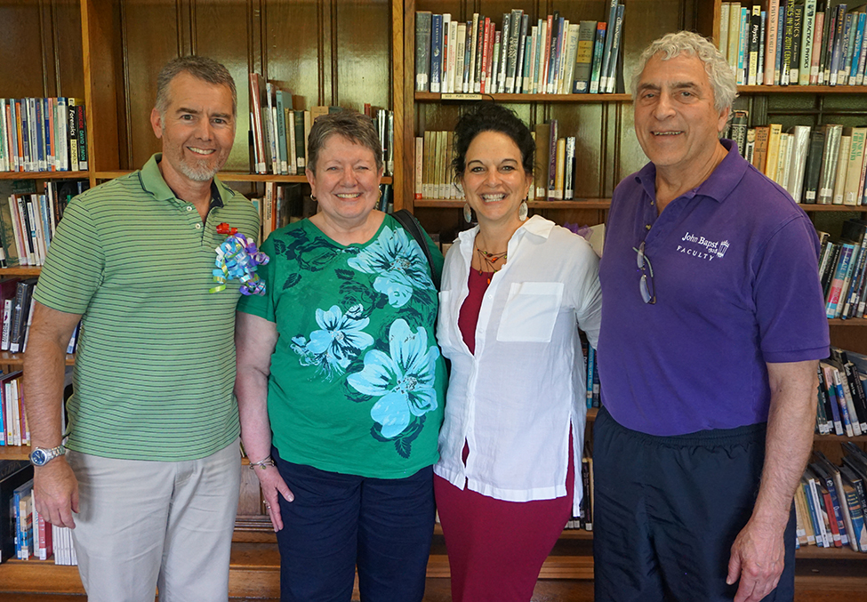 John Bapst faculty and staff gathered yesterday, June 2, to honor and thank departing faculty and staff members for their many years of devoted service to John Bapst Memorial High School. Students had graciously honored and thanked these special members of the John Bapst family at a schoolwide assembly earlier and yesterday was a chance for colleagues to do the same. Those individuals departing John Bapst are Lisa Manter, School Counselor, after five years, Mark Tasker, Social Science Department Chair, after 13 years, Carol Robb, Fine Arts Secretary, after 24 years, and Richard Soucy ’64, Physical Education and Wellness Department Chair, retiring after 42 years at John Bapst.