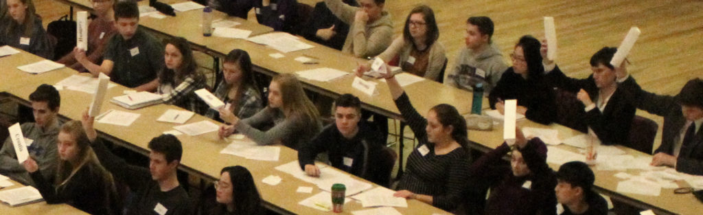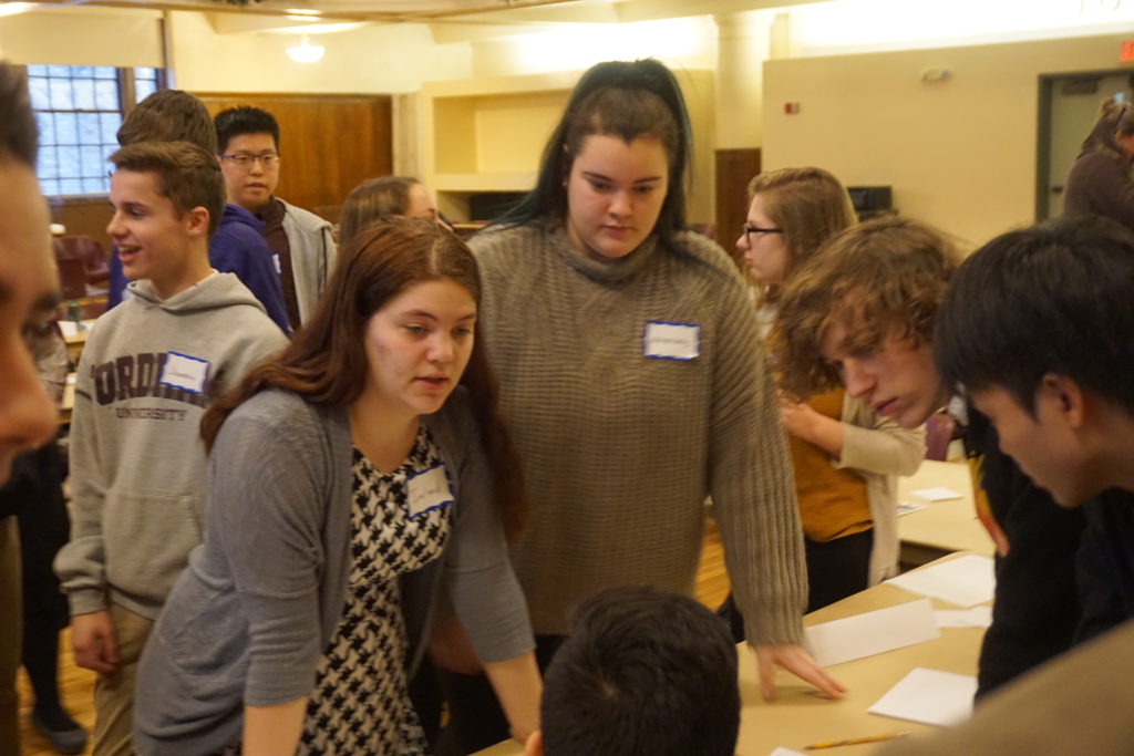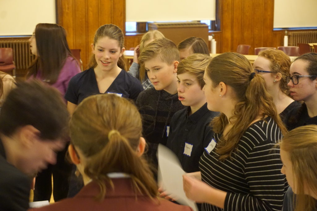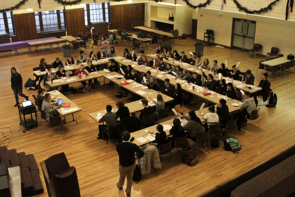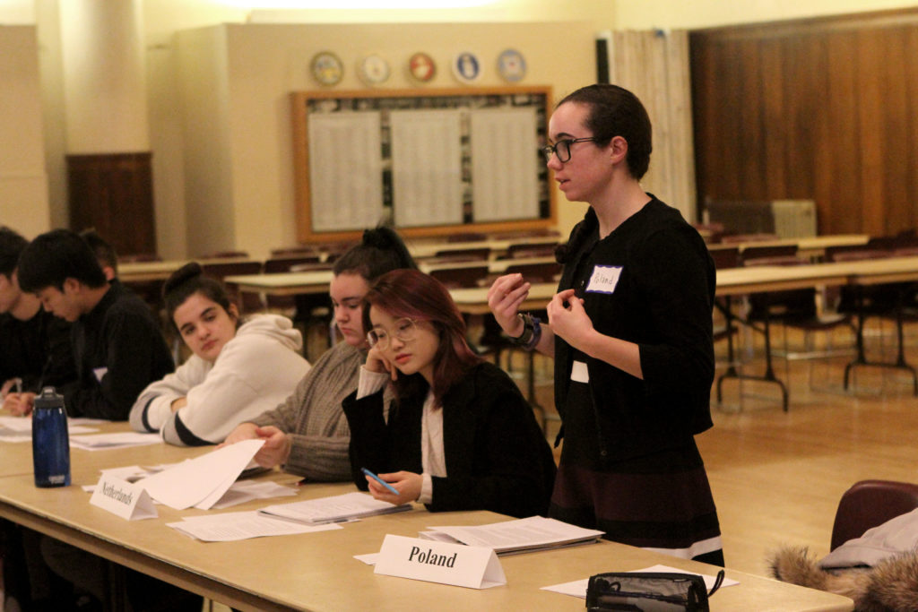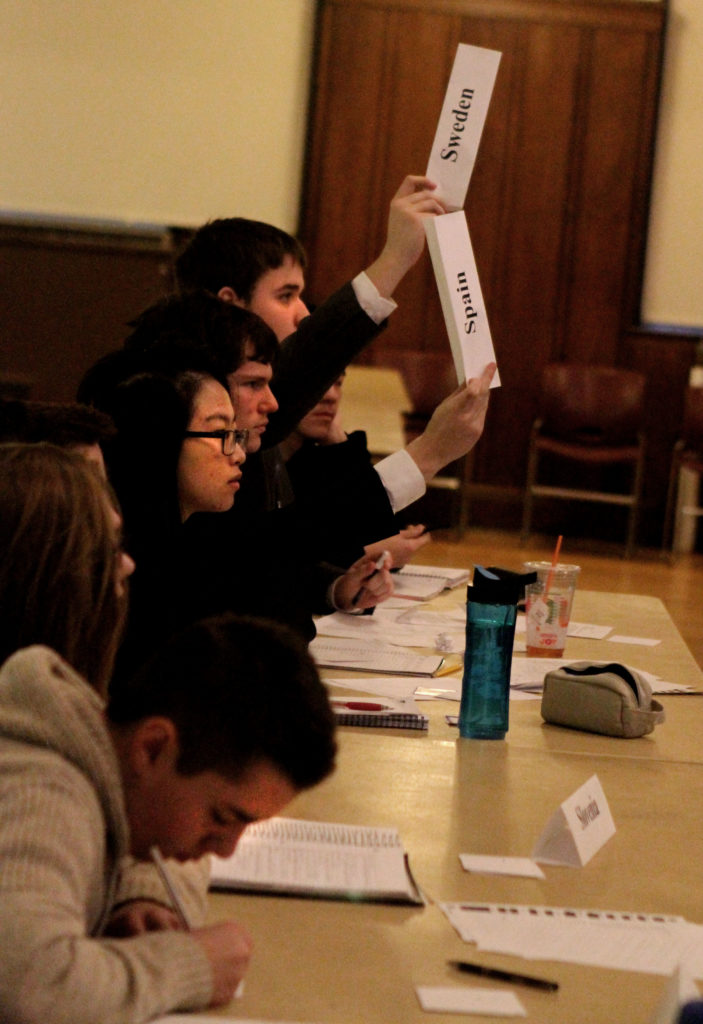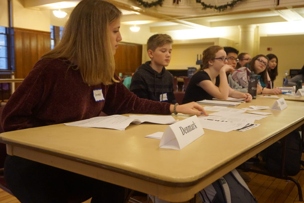 John Bapst students debated the subject of Brexit in a Model UN simulation in Sekera Auditorium, Wednesday, Jan 9. The debate included students from three sections of Ben Hale’s AP Human Geography class who represented various European Union countries. Five former alumna acted as Model UN chairs orchestrating the debate, and runners between representatives.