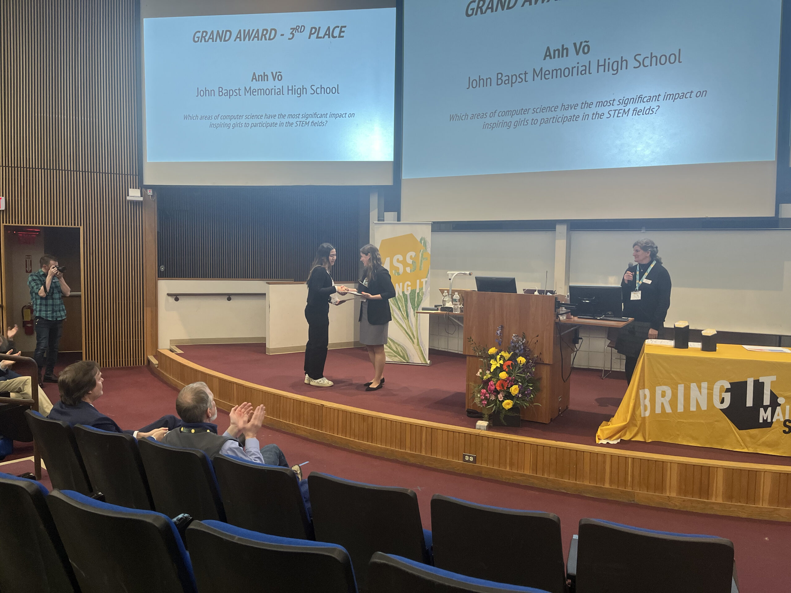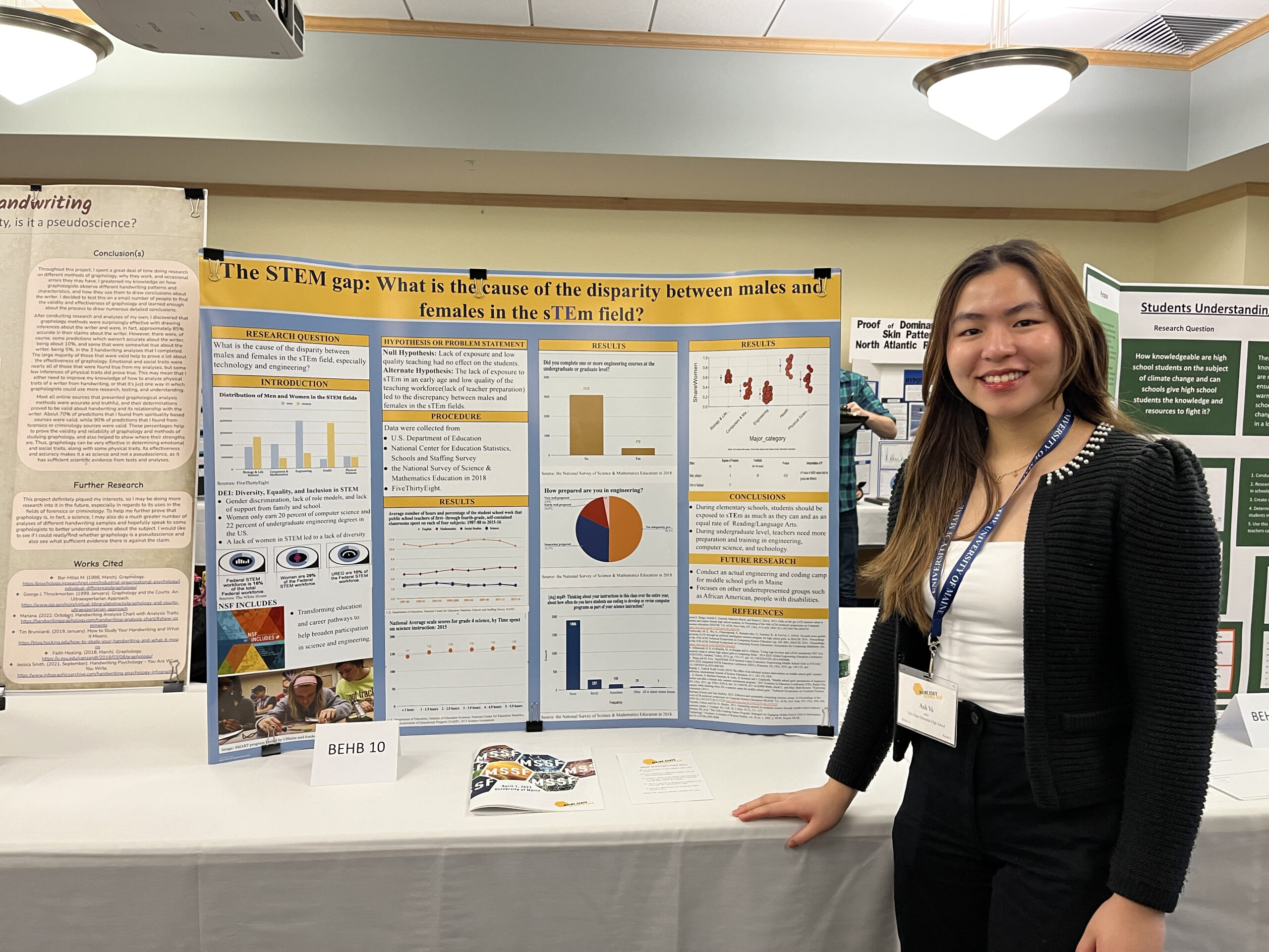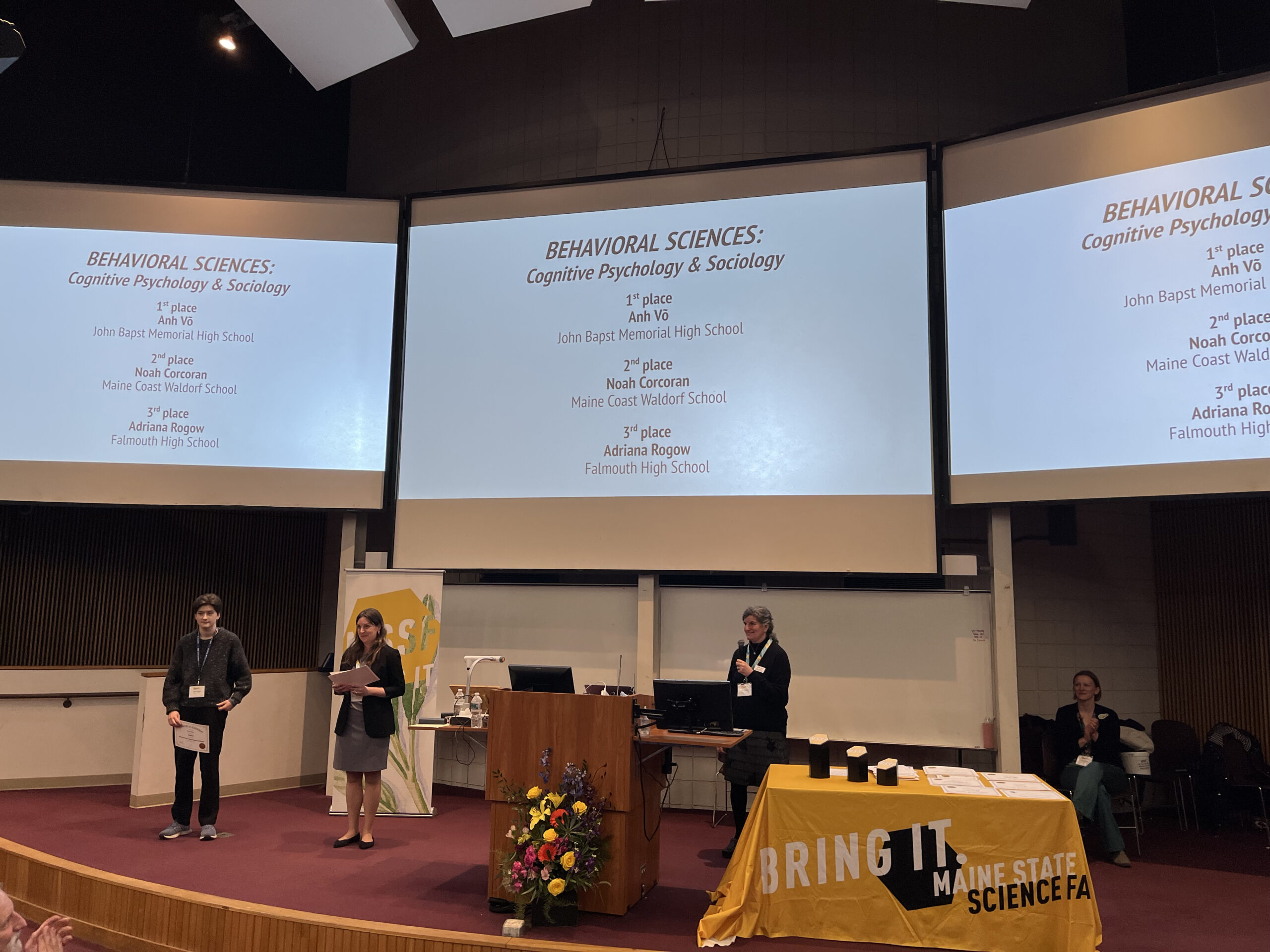Anh Vo won a 3rd place Grand Award, (the top category of the entire competition) and a 1st place in the Behavioral Sciences – Cognitive Psychology & Sociology category, as well as a full-tuition scholarship to the University of Southern Maine. Her Grand Award topic was “Which areas of computer science have the most significant impact on inspiring girls to participate in the STEM fields?” The award includes representing Maine at the Regeneron International Science and Engineering Fair in Dallas, Texas in May.