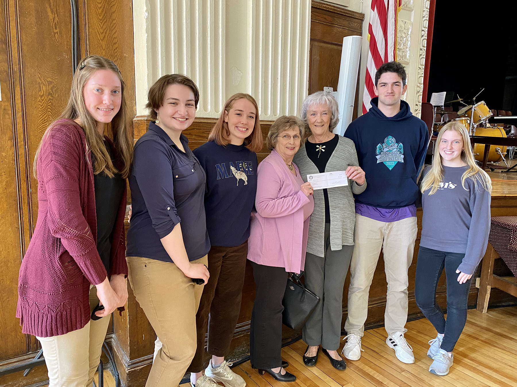 John Bapst National Honor Society Officers presented a check to My Friend’s Place representatives, Barbara Fister and Sylvia Valentine, at the May 18th school-wide assembly. The $708.25 check includes all NHS fundraising for the spring semester, including proceeds from carnation sales on Valentine’s Day, a coin drive, and Waffle Day. My Friend’s Place is an adult day care center in Bangor for people coping with memory loss, dementia or who are socially isolated.